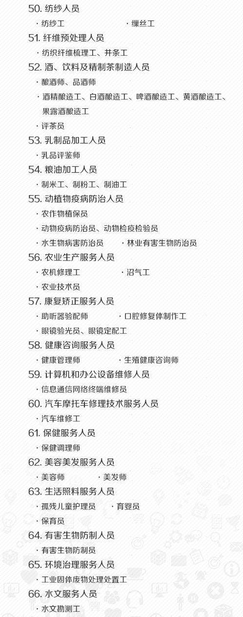 近日,經(jīng)國務(wù)院同意,人社部公布140項國家職業(yè)資格目錄。其中包括專業(yè)技術(shù)人員職業(yè)資格59項,技能人員職業(yè)資格81項。目錄之 外一律不得許可和認定職業(yè)資格。